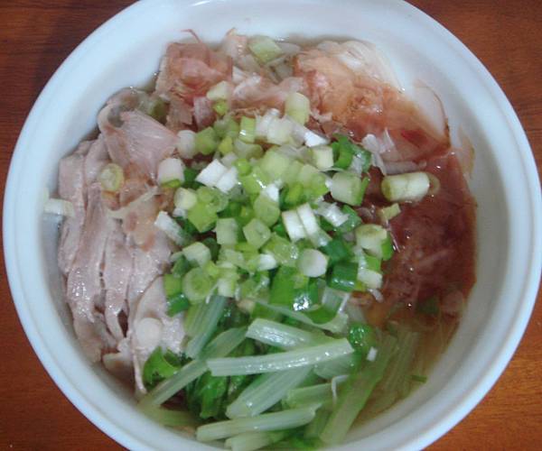 麵條+梅花豬+小白菜燙熟,再+柴魚片和蔥花,再+麵之友風味醬油或白味之友風味醬油,料多味美的ㄧ人乾拌麵。趕快趁熱享用。