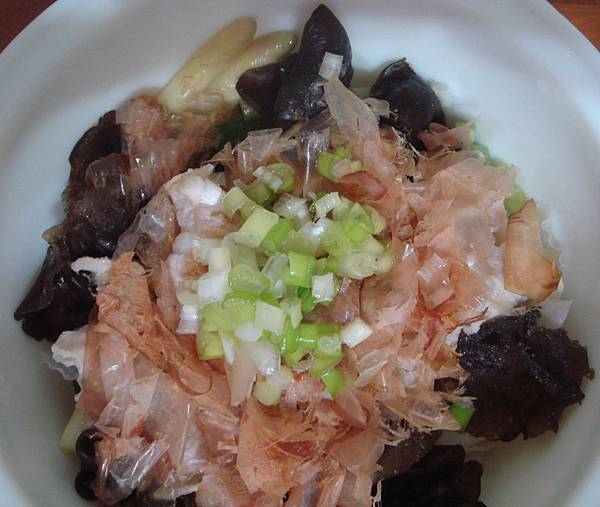麵條+川耳+白蘆筍燙熟,再+柴魚片和蔥花,再+烏龍麵調味料,乾拌麵再變化。你也可以玩出你自己的花樣。