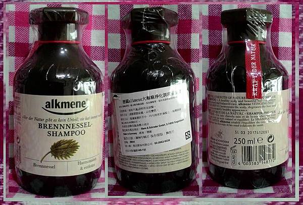 *德國Alkmene草本耀典大蕁麻淨化養髮露正面、中文說明、背面。*裝養髮露的瓶子為褐色不透明的玻璃瓶,能使養髮露保存良好,品質穩定不易變質。